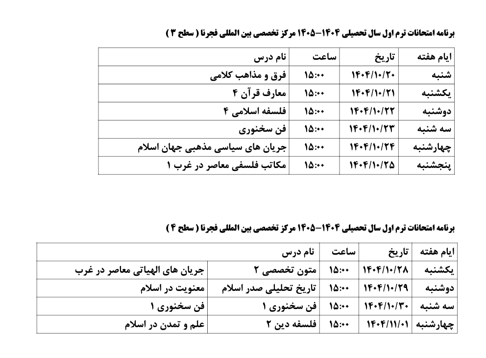 برنامه کلاسی نیمسال دوم ورودی های دوم و سوم رشته مطالعات اسلامی به زبان عربی و انگلیسی سال تحصیلی 1404-1403 اعلام شد. کلاس ها از اول بهمن ماه برای دانش پژوهان سطح سه 3 و از ششم بهمن ماه برای دانش پژوهان سطح چهار 4 آغاز می گردد.